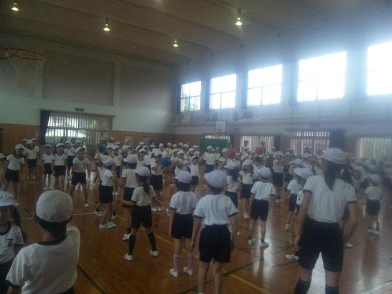 今日は縦割り班(1年〜6年合同編成班)で ボール回しをしました 初の縦割り班活動でしたがみんなで楽しく運動できました