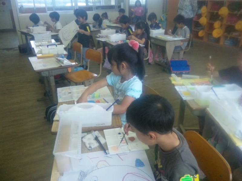 きょうはスケッチたいかいです ならいたてのえのぐをつかって ともだちとあそんだようすをかきました