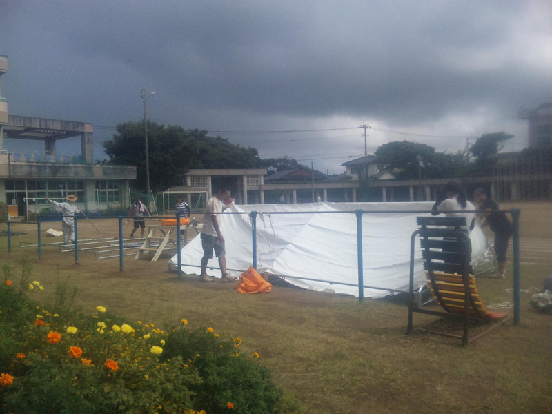 集落の体育部長さん方を中心に準備中です にわか雨もふり少し悪戦苦闘しました