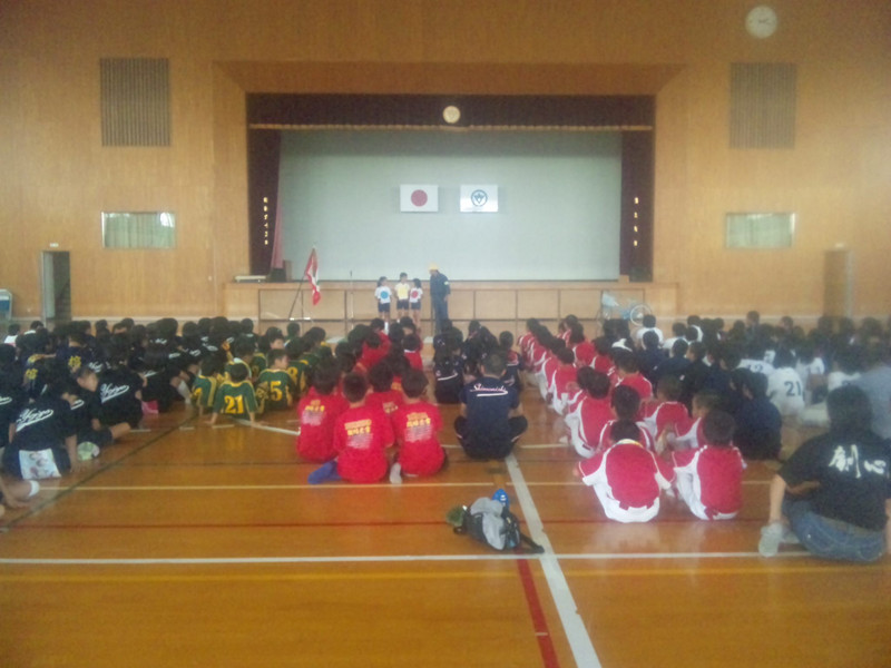 西之表市のスポーツ少年団が市民体育館に集まり、交通教室を行っています。