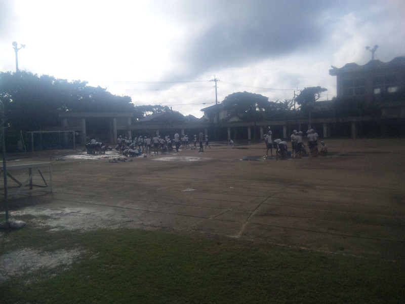 昨日の雨で校庭がみずびたしに…… 人海戦術 雑巾でみずたまりの水をとります