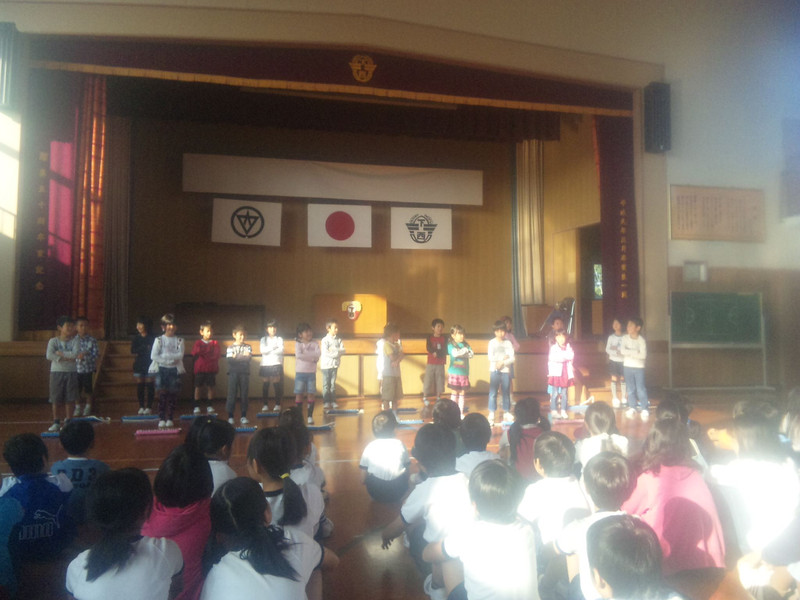 今朝は1年生の発表でした。 『しろくまのジェンカ』を歌って踊って舞台前に。 そして『手をたたきましょう』を歌いながら、カスタネットでリズム打ちをしました。 最後は『おちば』を歌ったり、鍵盤ハーモニカで演奏しました。 初舞台に緊張していましたが、子どもたちは楽しかったぁとの感想でした。 学習発表会では、もっと元気な発表になることでしょう。