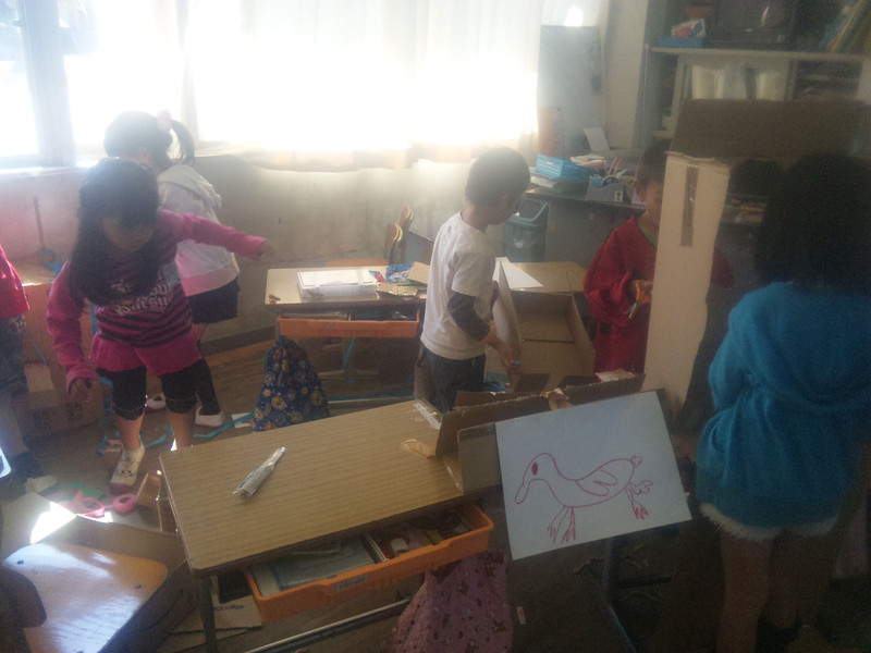 段ボールを使ってグループごとにお家を作っています。 たのしいいえ まほうのいえ おしろのおうち 各グループともにめざすお家を考え、建設中です。