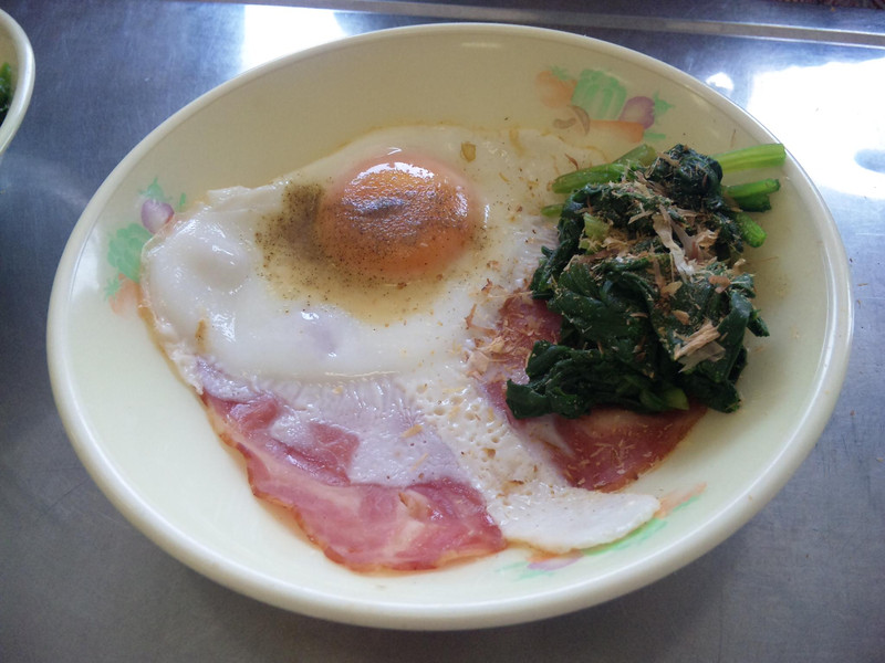 今日は ほうれん草と目玉焼きです。 目玉焼きは、自分の好みのかたさに焼きました。