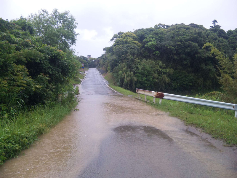 上石寺下石寺あまどまりの無線方面から登校するさいは写真のとおり道路が一部冠水していますので、県道をそのまま下りて、まつもと方面を通るよう声かけをしています。 下校のさいも同様です。