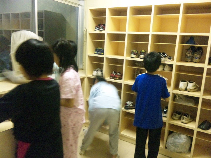 一日の活動でぬれたくつの中に新聞紙を詰め込み中